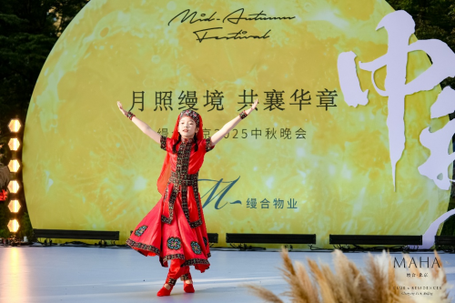 直至夜色深沉,林间团圆家宴与中秋晚会接力上演——业主们于席间伴着特色美食的香气,一边惬意品尝,一边聆听舞台上的精彩:《我爱你中国》唱出心中豪迈与深情,维吾尔族舞蹈《乌兰图雅》点燃夜晚激情,披帛舞蹈《长安啊》尽显千年长安的大唐风华……一轮圆月之下,食物的暖意、欢笑声与歌舞声交织相融,让全场都沉浸在“大家庭”的温暖里。